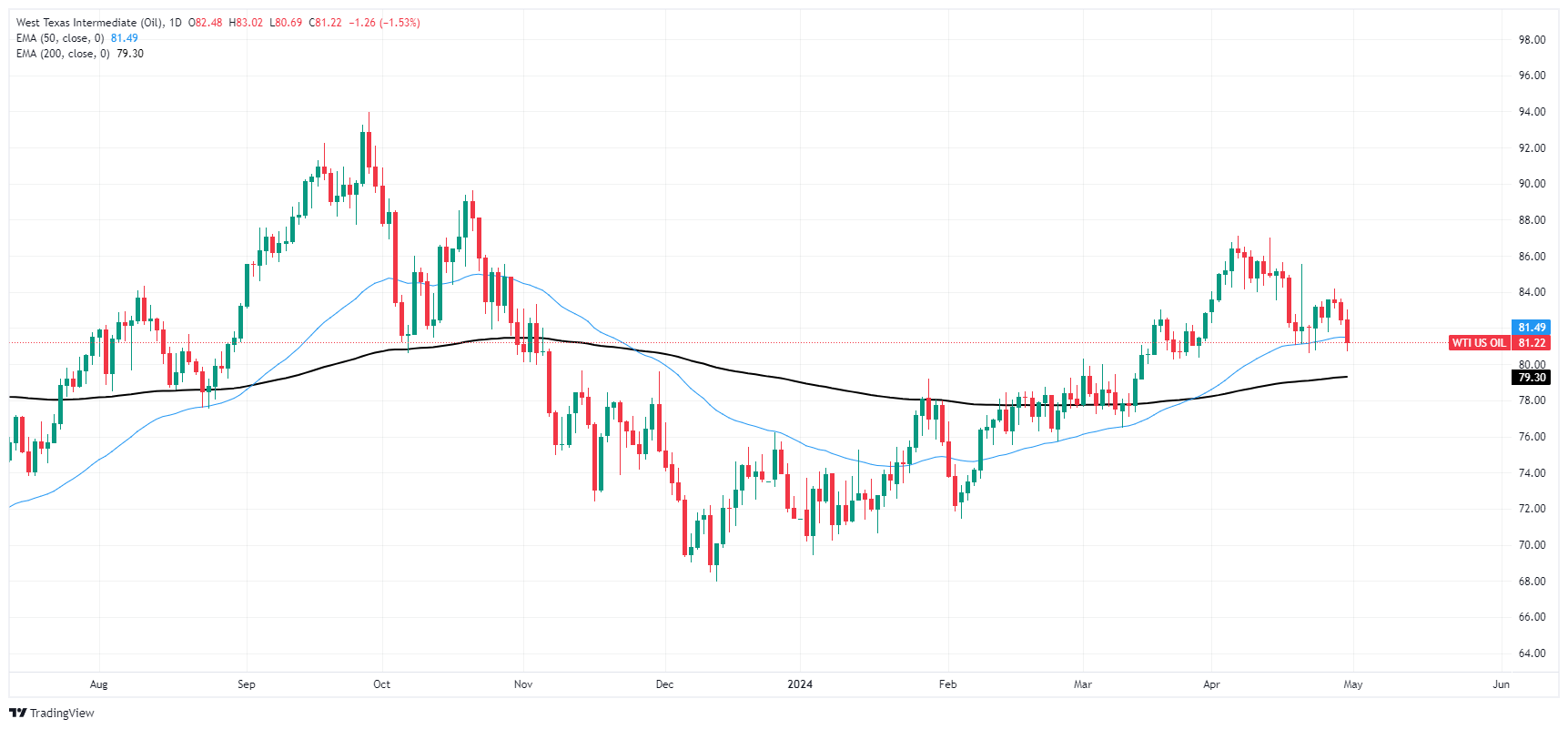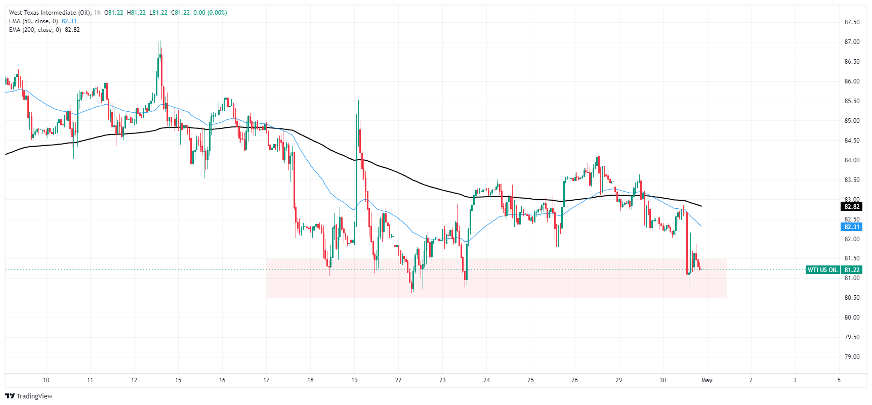 由于美国 原油的看涨动能仍有限,WTI油价已跌回 81.00 美元附近熟悉的供应区。 WTI油价上周未能守住 84.00 美元的水平后转入下跌,自 4 月初上一个波段高点在 87.00 美元附近见顶以来,技术图表上出现高位下移的形态。