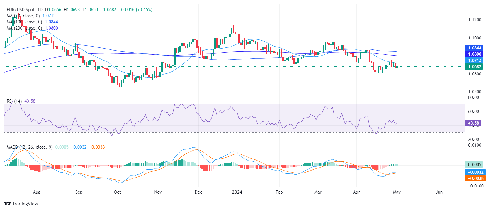 在 日缐图上,相对强弱指数(RSI)位于负区域,最近数据為 44,显示看跌势头持续。这与自 4 月初以来的几个交易日中观察到的看跌氛围不谋而合,所有数据均保持在负值区域内,没有一个数据超过 50,表明卖方在市场中占据主导地位。侭管如此,移动平均收敛背离指标(MACD)显示出积极的势头,其绿色柱状图目前保持平缓,表明存在一些𧹒盘行动。