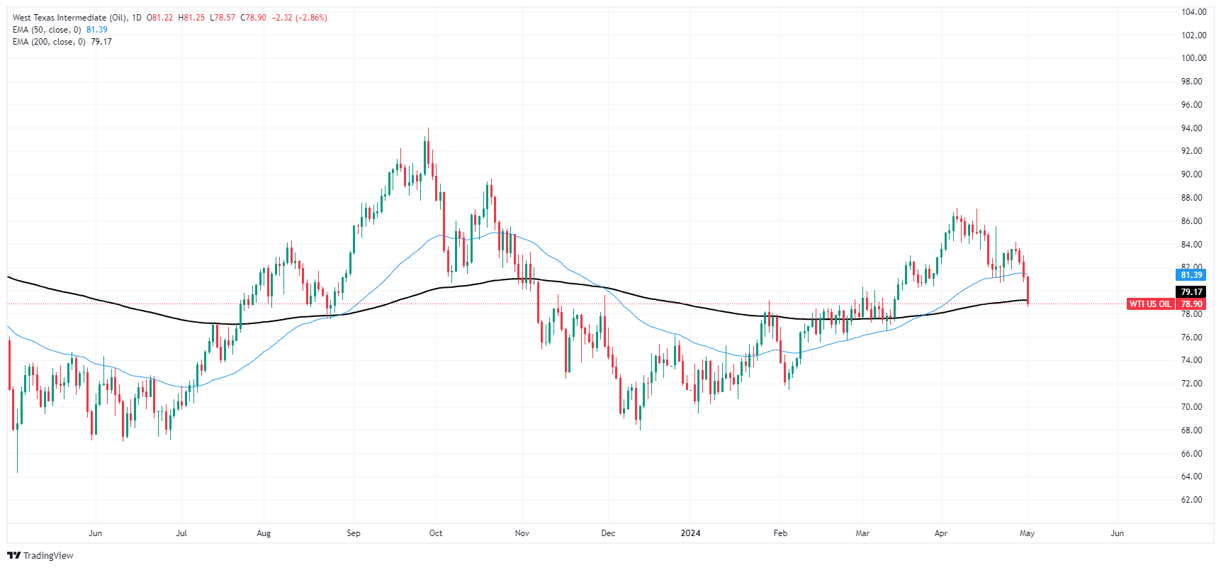周三,WTI油价跌破每桶 80.00 美元,因為美国原油供应继续超过需求,而联准会在减息道路上仍然步履蹒跚。