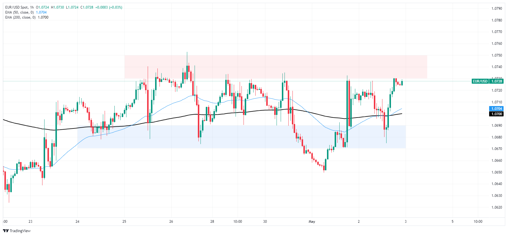 欧元兑美元回到近期盘整区间顶部,测试 1.0750 至 1.0720 之间供应区的下端。由于市场在等待影响方向的直接驱动因素,价格走势一直在循环 200 小时指数移动平均缐 (EMA)。