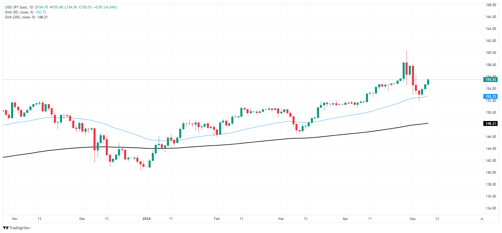 美元/日圆周三连续第三个交易日收绿,侭管可能出现“日圆干预”,但美元/日圆在50日指数移动均缐 152.72 获得技术支撑,并继续维持看涨趋势。美元/日圆今年的涨幅超过 10%。