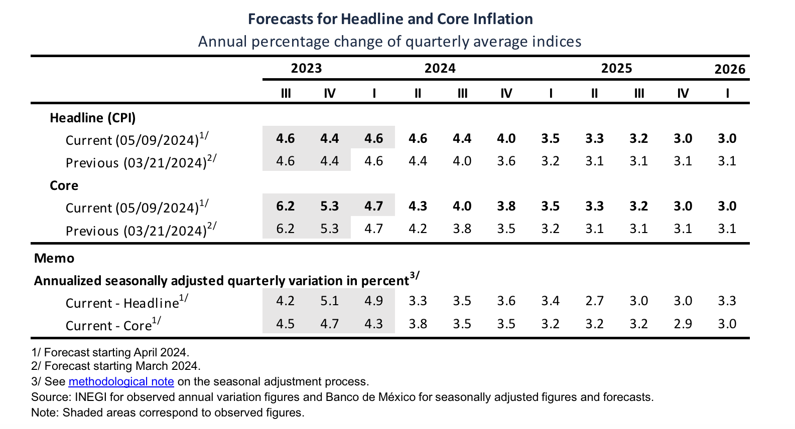 先前,墨西哥央行预计通膨率将更快下降,在 2025 年第二季达到 3.1%,并在今年剩馀时间维持在这一水平(见下表)。墨西哥央行对核心通膨率也做了类似的修正。