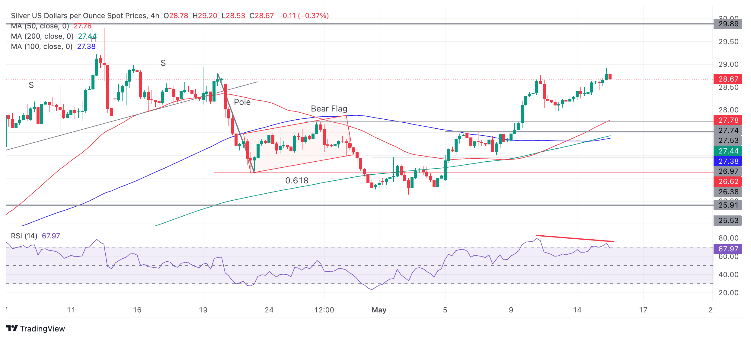 白银(XAG/USD)价格在美国发布影响市场的数据后上涨至 5 月新高 29.20 美元。