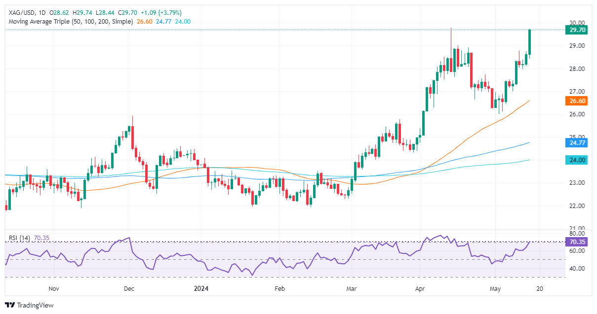 银价突破了 29.00 美元和 29.50 美元的心理关口,但仍未突破 29.79 美元这一年内迄今(YTD)高点。正如相对强弱指标(RSI)所显示的那样,这使得银价双顶隐现,但势头有利于𧹒方。