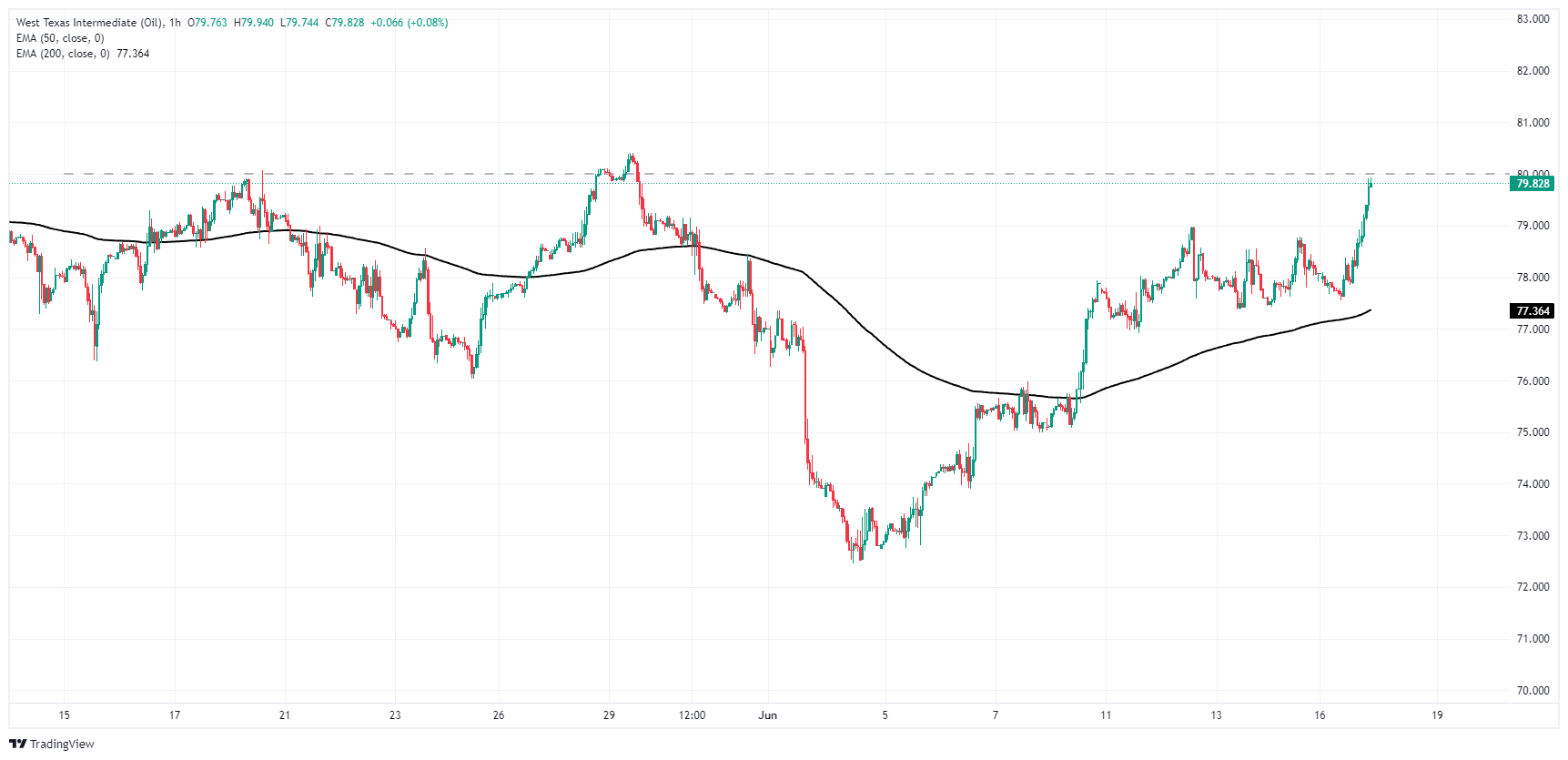 WTI油价攀升至处在 78.81 美元的 200 日指数移动均缐 (EMA),接近 80.00 美元关口附近的区间,延续自近期数月震盪区间低位 72.45 美元反弹的趋势。