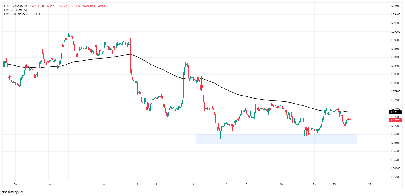 欧元兑美元继续陷入近期盘整,200小时指数移动均缐(EMA)从1.071𫔭始对日内价格走势构成压力,但1.0680下方的需求区构成技术支撑,并使𧹒盘得到支撑。