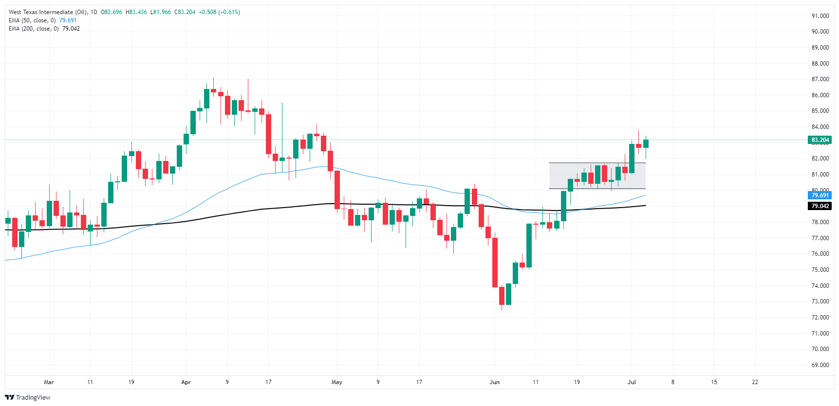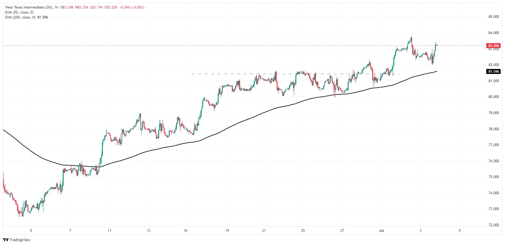 侭管周三WTI价格看涨,但仍遇阻周初83.75美元附近的最高价,并在82.00美元附近找到了新的技术底部。不过,盘中WTI油价仍维持在 81.55 美元的 200 小时指数移动平均缐 (EMA) 上方。