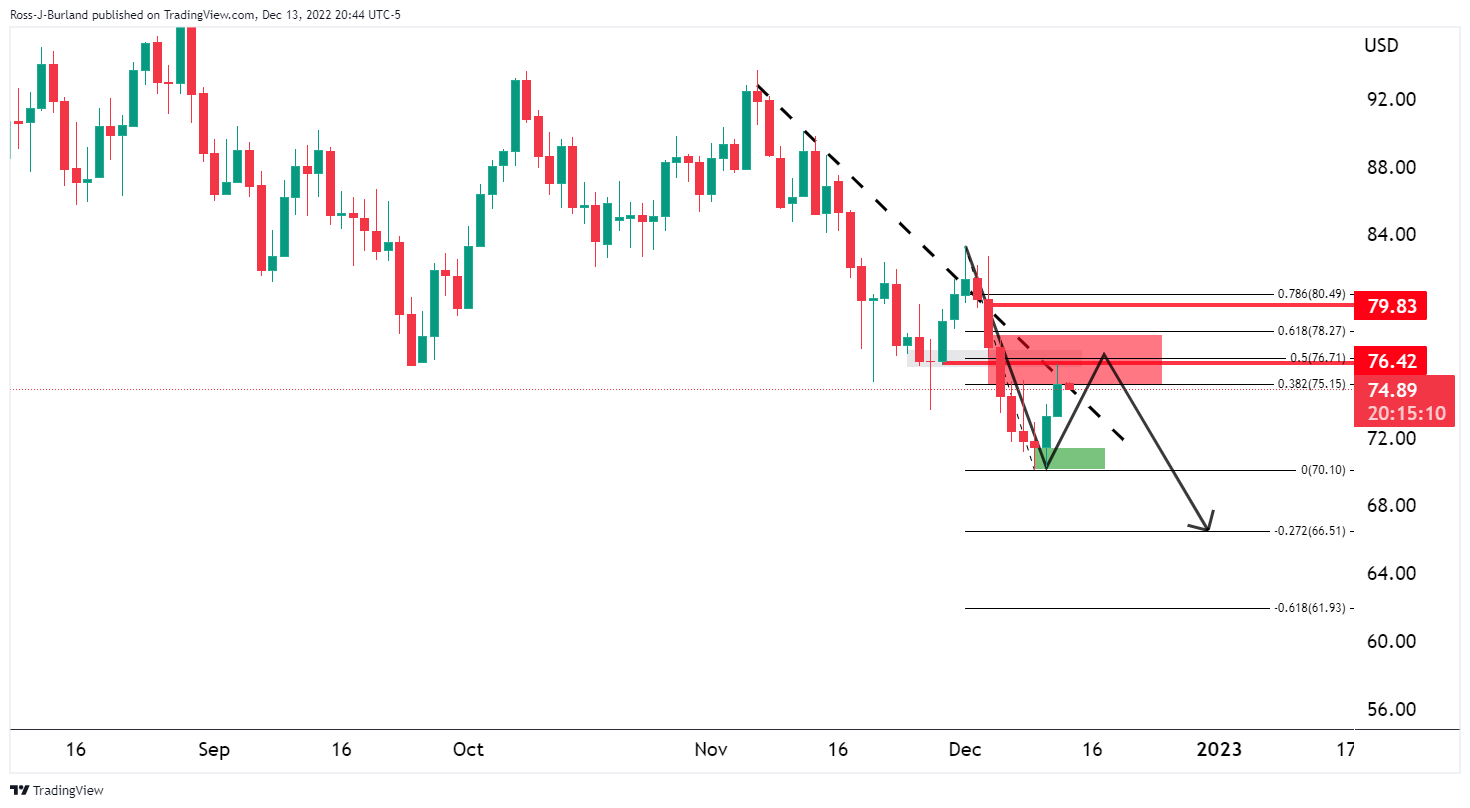 多头遇到关键阻力,并在本周收盘前维持挣扎。小级别周期显示,若WTI油价突破阻力,将打𫔭WTI油价数日内测试77.50美元的风险。美元/加元一度触及77.74美元,但随后遇到阻力,如下所示: